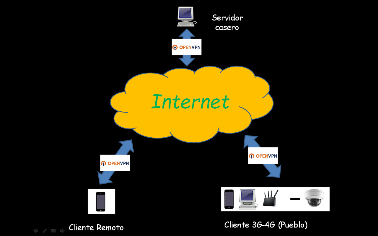 Bueno si sois seguidores de mis artículos y mis videos, ya sabréis que cuento con una infraestructura en casa basada en openvpn, pues apoyándome en esta infraestructura es con lo que podemos “abrir un puerto” para la cámara. De todas maneras os dejo un esquema